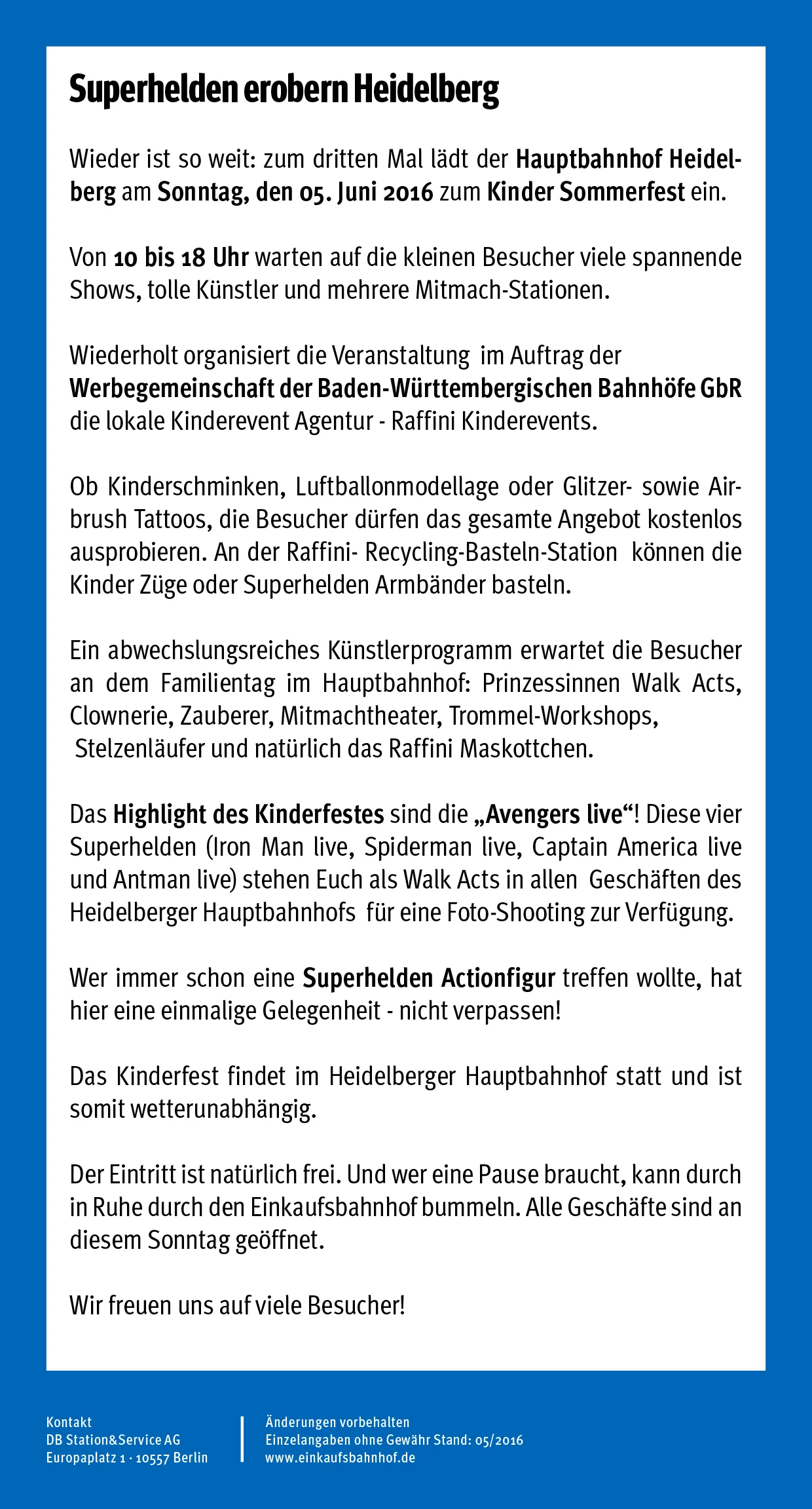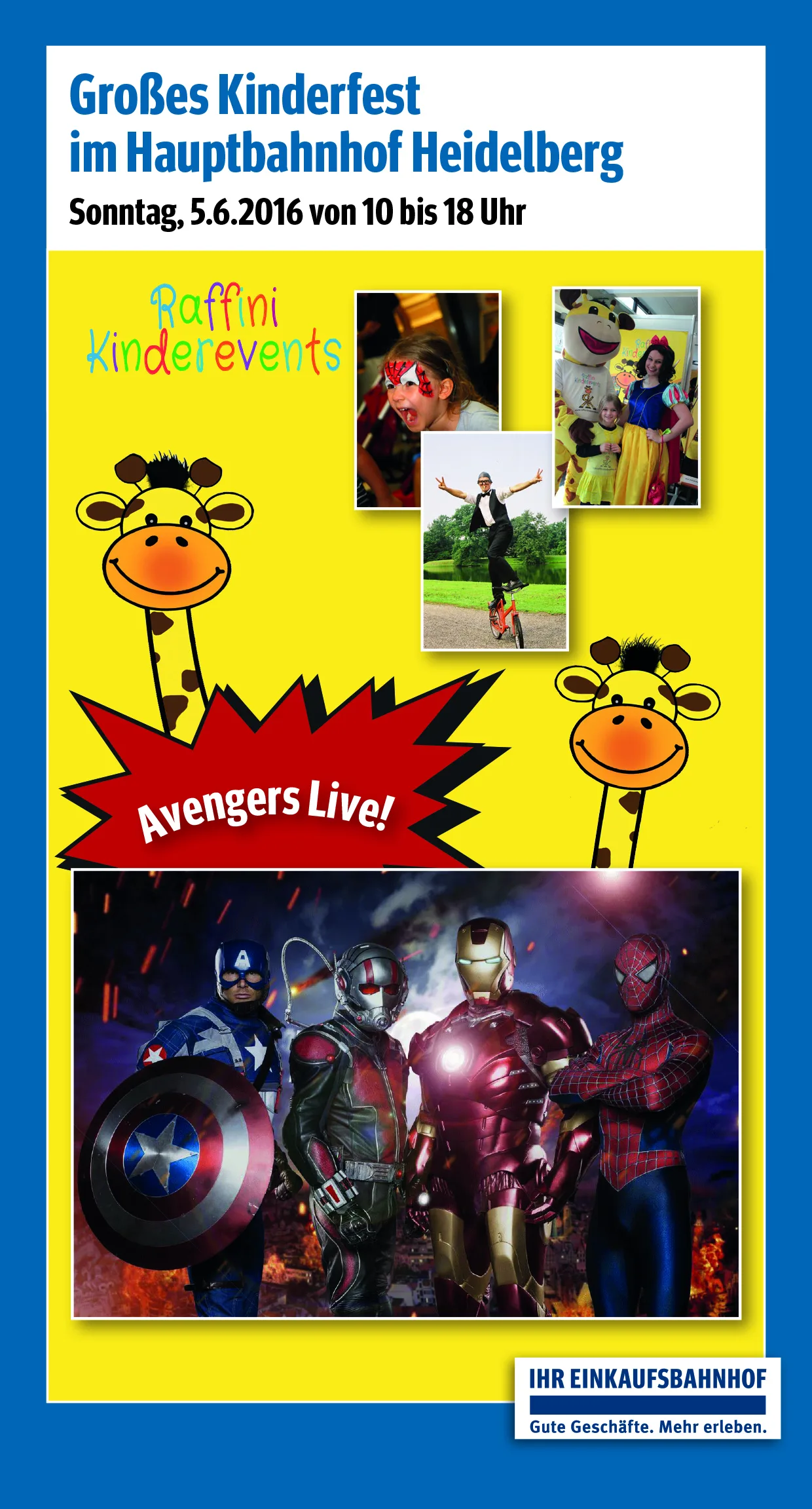 Die vier Superhelden (Iron Man live, Spiderman live, Captain America live und Antman live) stehen als Walk Acts in allen Geschäften des Heidelberger Hauptbahnhofs für ein Foto-Shooting zur Verfügung. Wer immer schon eine Superhelden-Actionfigur treffen wollte, hat hier eine einmalige Gelegenheit. Das Kinderfest findet im Hauptbahnhof statt und ist somit wetterunabhängig.
