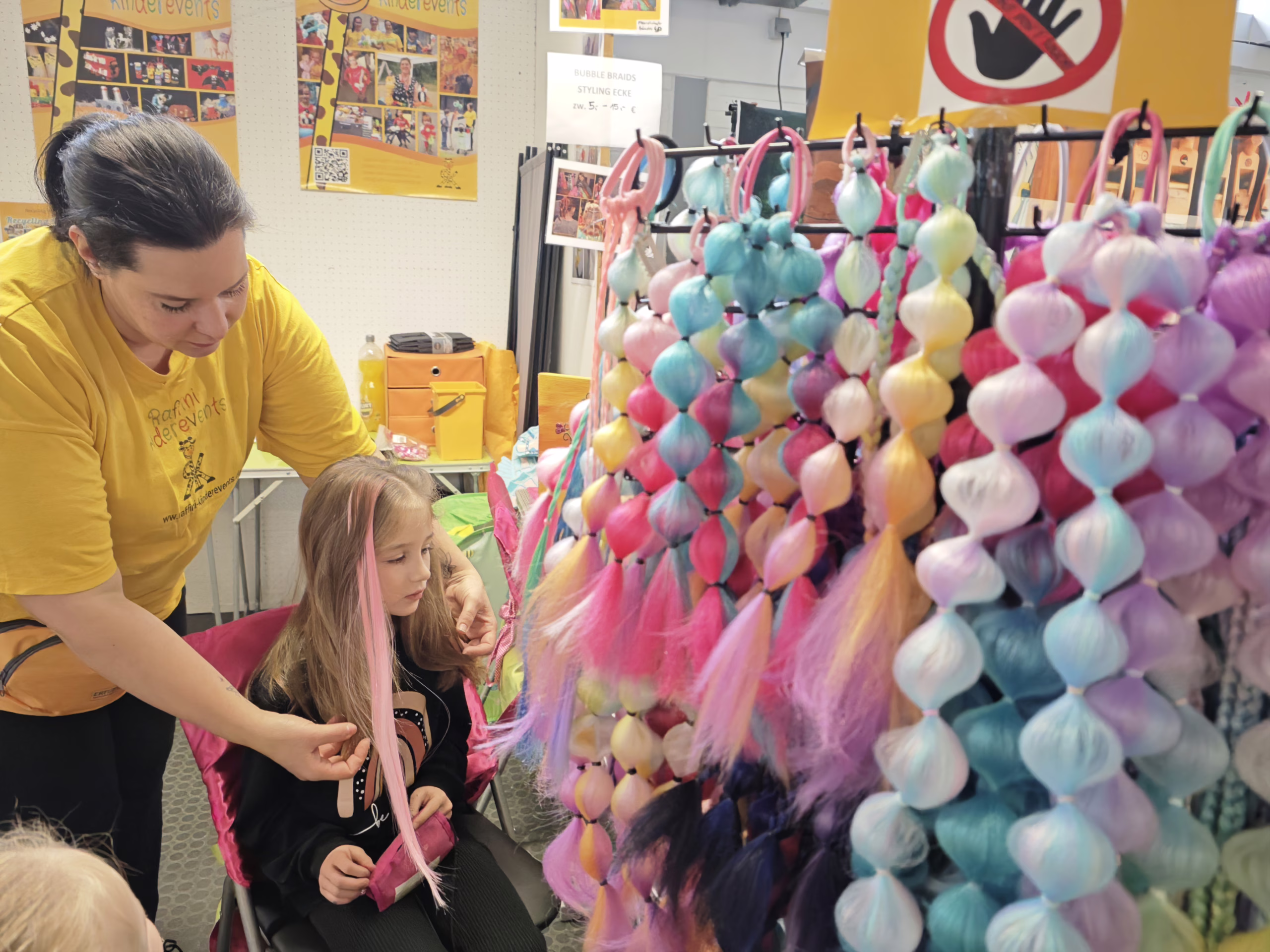 Hier allerdings kein Kinderschminken und Ballonmodellage (macht ein anderer anbieter in der Halle), dafür aber Airbrush Tattoos und Glitzer Tattoos, sowie Haarsträhnchen und Bubble Braids.
