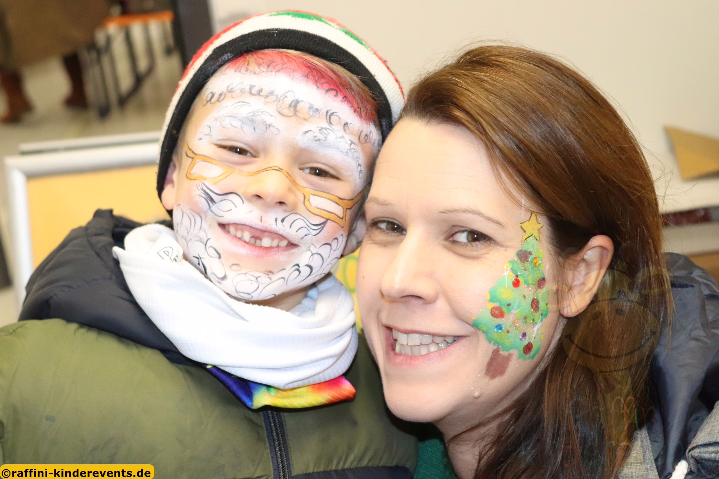 Ob Grinch, Nikolaus, Weihnachtselfen, Weihnachtsbäumen, Eiskönigin, Schneeflocken, Renntiere – diesmal hat Raffini Kinderevents sowohl beim Kinderschminken, wie auch bei bunten Glitzer Tattoos wieder passende Motive dabei!